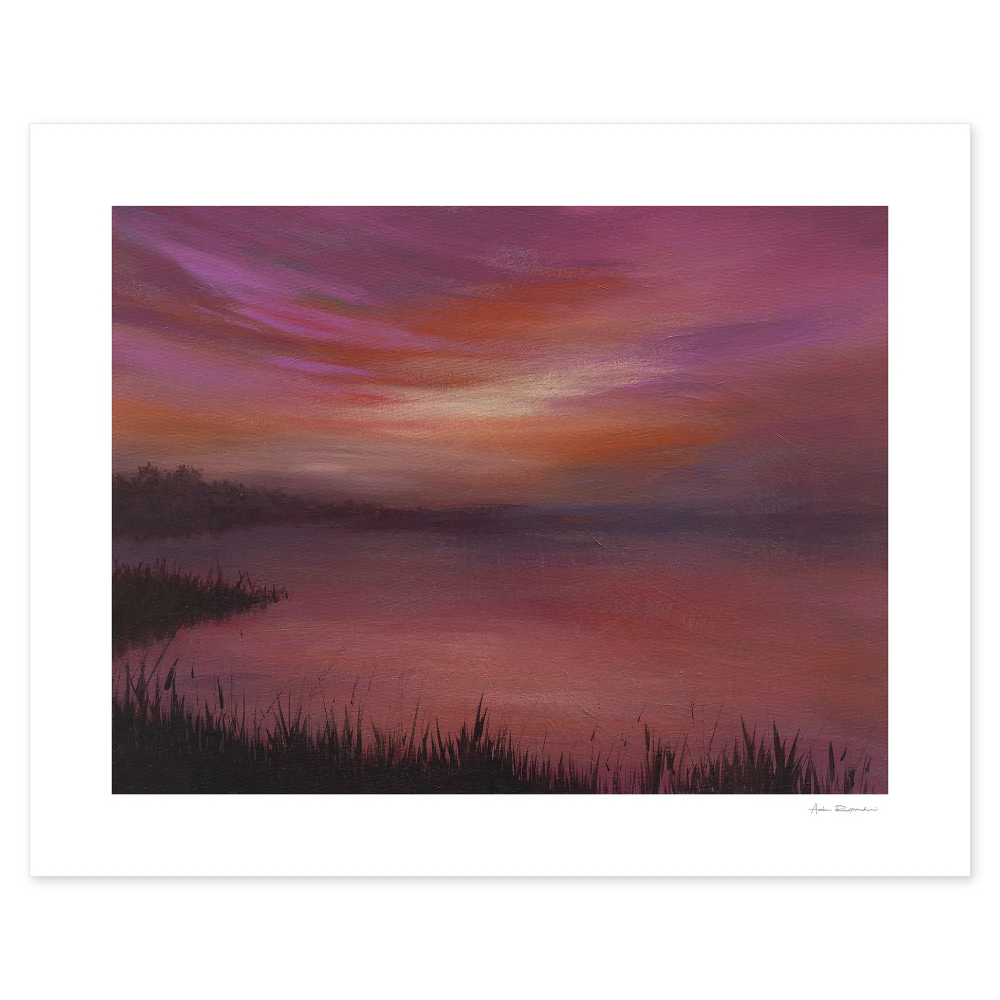 I could watch the colours in the sky change all the time. This artwork captures the warm hues at sunset. Colours reflecting off the water are so soothing to me.