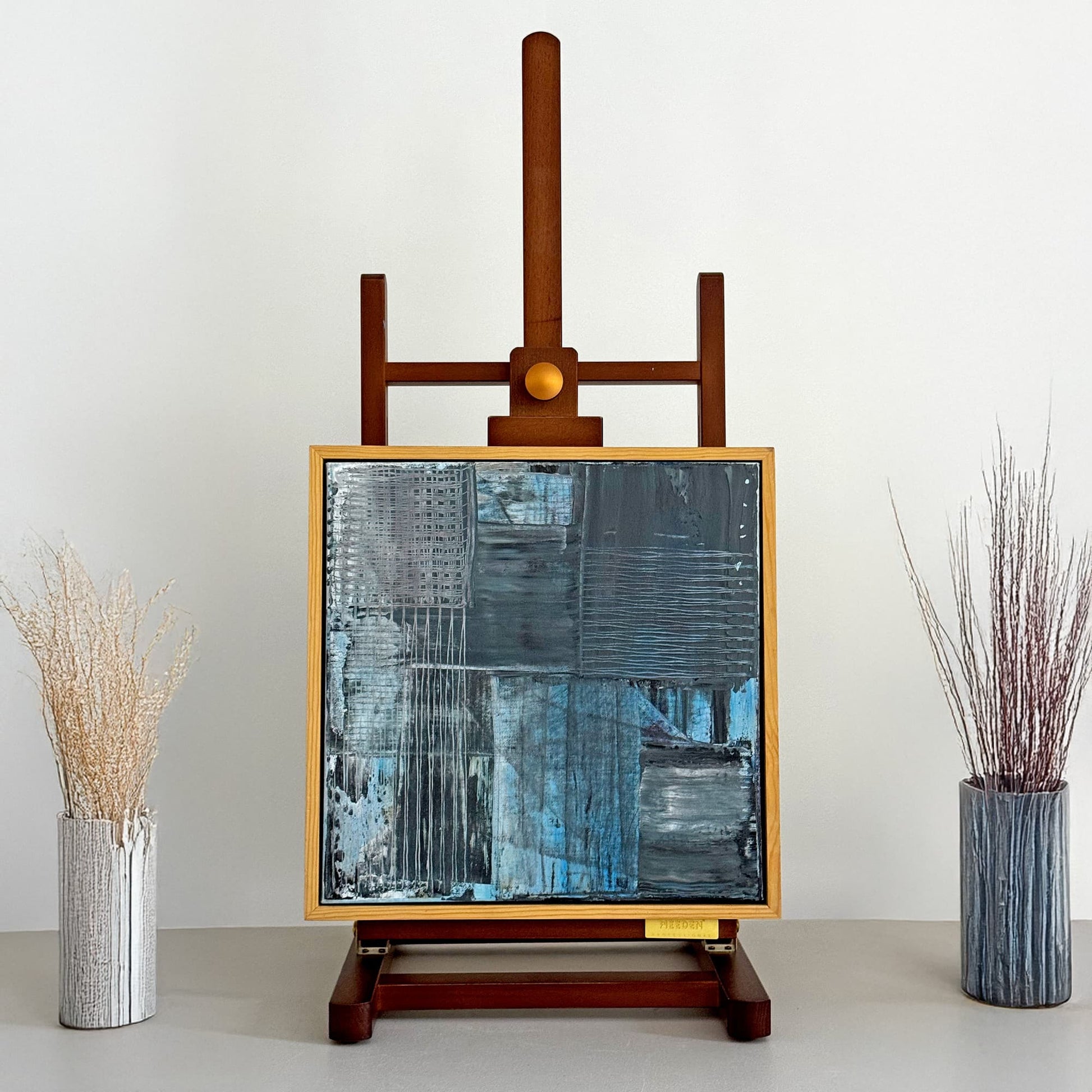 Industry is a 38 x 38 cm abstract acrylic artwork inspired by the textures and tones of industrial materials. Created intuitively, it explores the cold, metallic blues and greys of metal and concrete, capturing the mood and feel of industrial spaces rather than any literal scene.