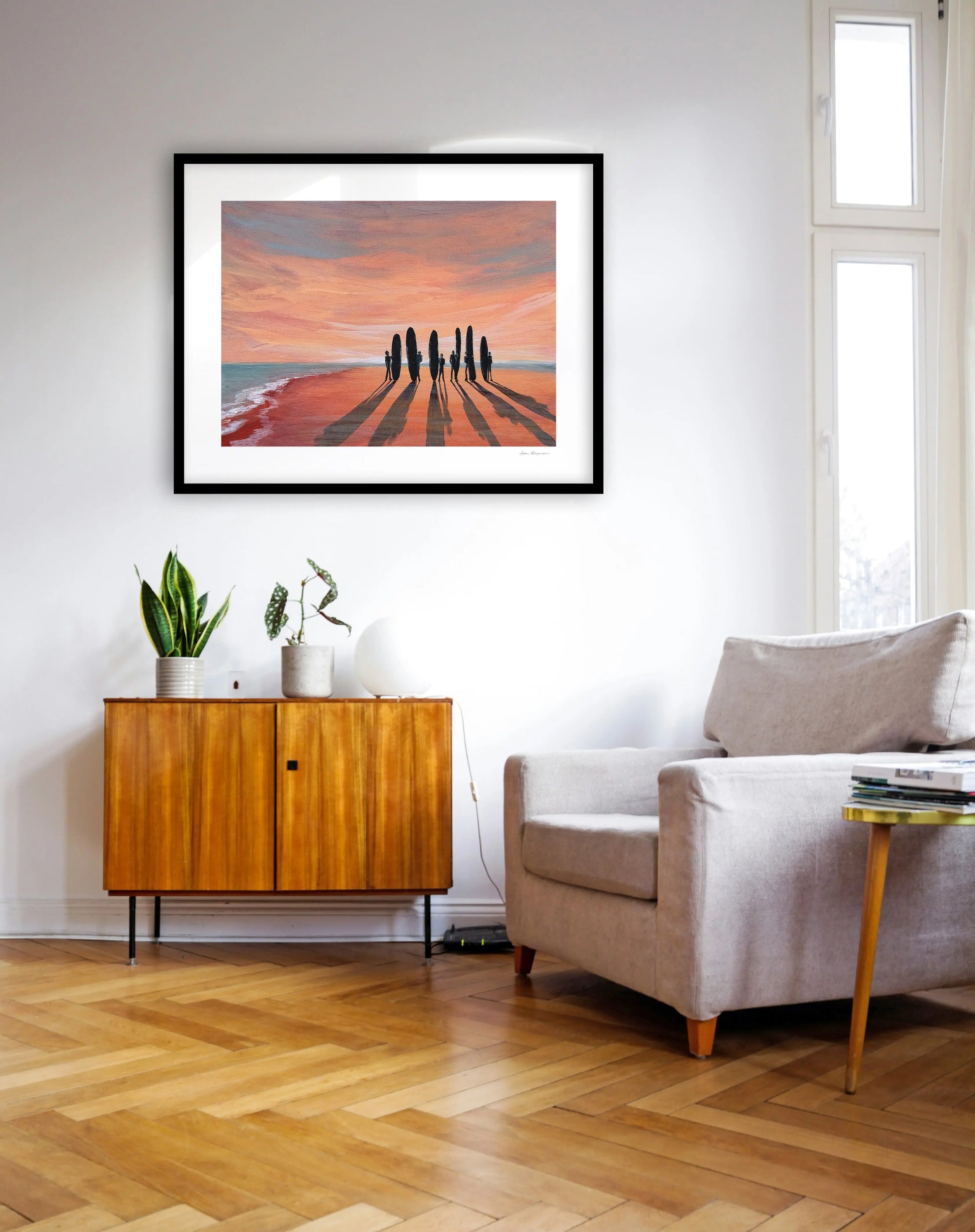 Surfer Silhouette is my take on those iconic old-school images of surfers lined up with their longboards. There’s just something effortlessly cool about them. That sense of calm before diving into the unknown, all facing the same horizon, totally in sync with the ocean.